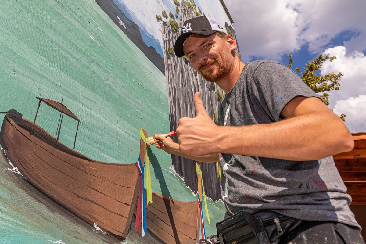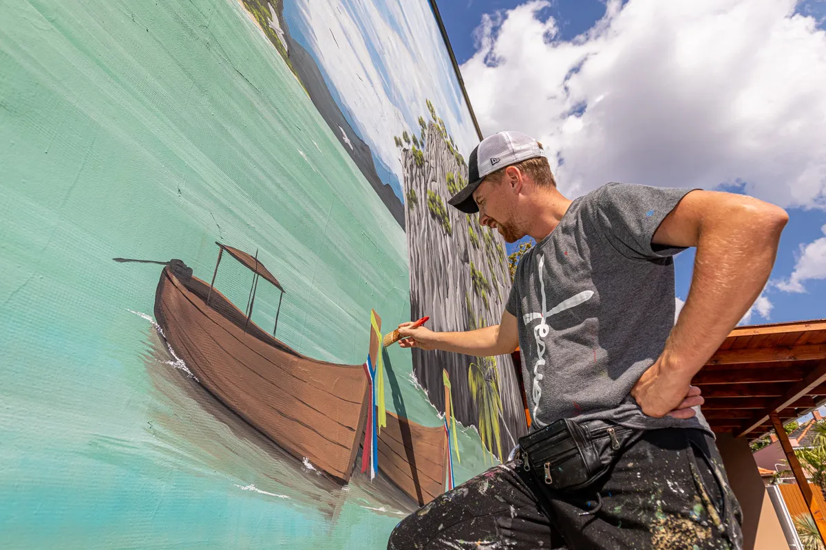 De ki legyen ehhez a roppant feladathoz a mester? Ki tud ilyen hatalmas méretű képet festeni? Csabi arra gondolt, az interneten néz utána a lehetőségeknek. Hosszas keresgélés után akadt Szalay Benjáminra, akinek egyik alkotását megtalálta a Facebookon – azt a képet több tízezren díjazták lájkokkal és a poszt alatt rengeteg pozitív visszajelzést kapott az alkotó. Ennél tökéletesebb referencia nem is kell! Csabi ráírt Benjáminra, majd telefonon is felvette vele a kapcsolatot.