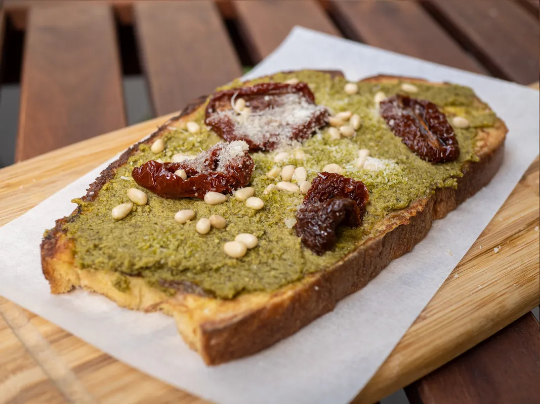 A mediterrán életérzés elképesztő intenzíven köszön vissza rögtön az első falatnál, igazi boldogságot jelentve a fogyasztónak. Az aszalt paradicsom édeskés-savanykás aromája klasszul kiegészül a pesztó zöldfűszeres ízvilágával. Mindez nem egy pizzán, hanem egy szelet bundás kenyéren: ez maga a csoda!