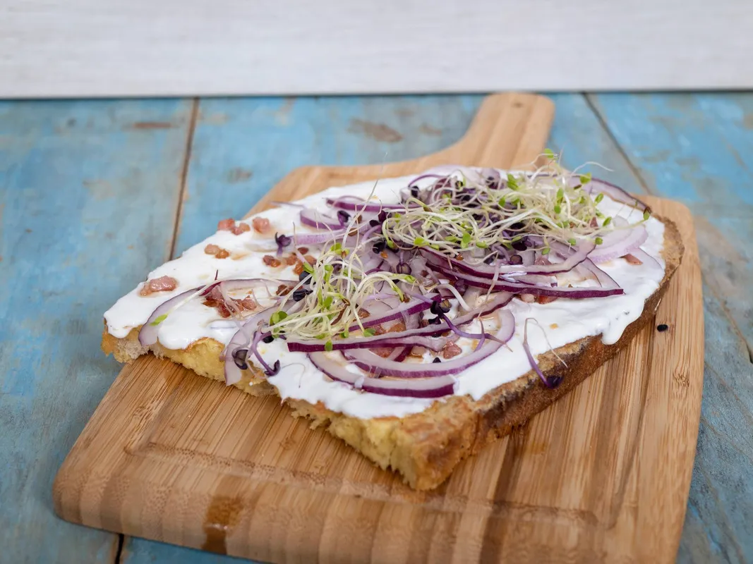A bundás kenyérre fokhagymás tejföl kerül, leheletnyi fokhagymával, ezt az alapot pirított kockára vágott és lepirított húsos szalonna és felkarikázott lilahagyma koronázza meg.