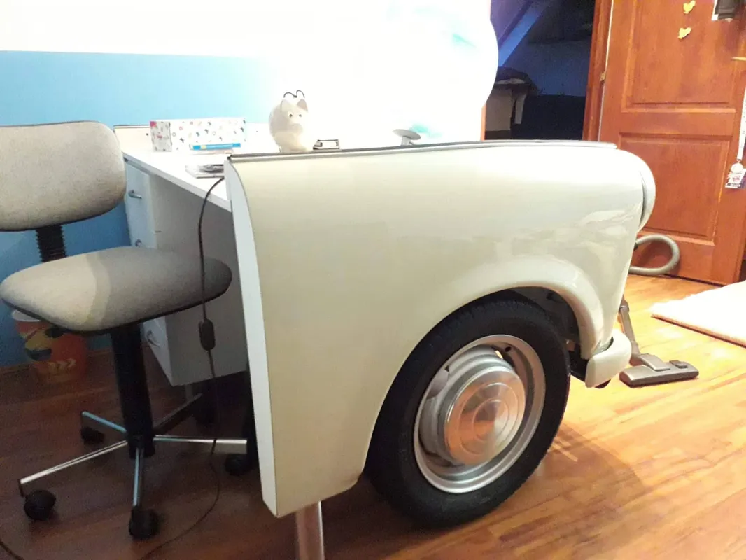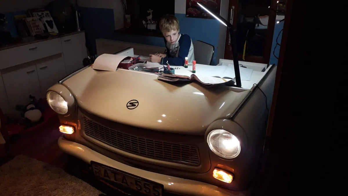 Jó apropó volt fia, Máté közelgő születésnapja, akinek szüksége volt egy új íróasztalra. Mivel ő is kedveli a család Trabantját, (amit a rendszáma után csak CHEguevarának hívnak), így adott volt a feladat! Az alkatrész Trabiból legyen íróasztal! „Az első munkám a fiamnak készült: egy Trabant teljes első részéből, körülbelül a gépkocsi harmadából íróasztalt alakítottam ki. Pont olyan lett, mint a rendszámos. Reméltem, hogy szeret majd ott tanulni.