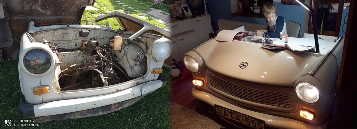De ennél sokkal jobban motivált, hogy örülni fog neki és ez tényleg így is lett. Az biztos, senkinek a világon nincs ilyen Trabant íróasztala, csak neki, és erre tényleg nagyon büszke még annak ellenére is, hogy az íróasztalnak sajnos mennie kell a háztól, mert egy kisebbet kell helyette csinálnom neki” – mesélte lapunknak Szabó Gergely, aki kanapét és TV állványt is készített már az egykori keletnémet papírjaguárból.