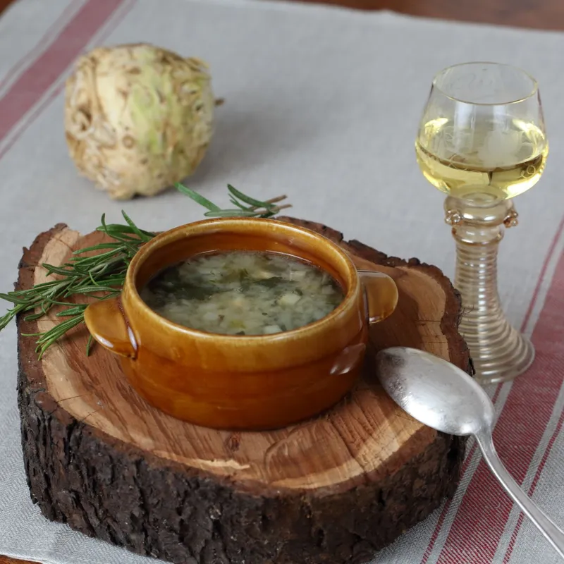 Hozzávalók: 4 nagyobb fej vöröshagyma közepes kockákra vágva, 1 nagy fej (öklömnyinél nagyobb) zellergumó, ebből 1 ujjnyi (kb. 5-8 dkg) apróra reszelve, a többi apró kockákra vágva, másfél ek. Kacsazsír, 2 ek. Vodka, 2 lapos ek. sima liszt, 1 marhahúsleves kocka, 1 lapos ek. Himalája só, 1 tk. őrölt fehér bors, 1 lapos ek. Vegeta, 1 csipet barna cukor, 1 kisujjnyi hosszú friss rozmaring levélkéi lecsipkedve, fél tk. apróra vágott friss lestyán (ha nincs, jó a szárított vagy őrölt is), 1 nagyobb levél friss bazsalikom, 1 nagy csokor zellerzöld, 20%-os tejföl a tálaláshoz.