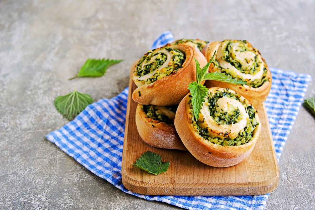- A megkent tésztalapot csavarjuk fel a szélesebb oldal felől, majd vágjunk belőle 2-3 cm-es darabokat. A csigákat sorakoztassuk sütőpapírral bélelt tepsibe, kenjük meg felvert tojással, majd 180 fokon kb. 20-25 perc alatt süssük készre.