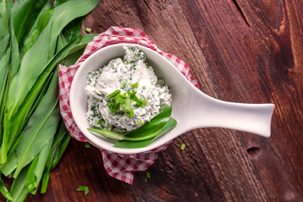 2 dl tejfölt vagy görög joghurtot keverjünk el 20 dkg natúr sajtkrémmel. Sózzuk, borsozzuk. Tetszés szerinti mennyiségben adjunk a krémhez apróra vágott medvehagymát és kész is van az ízletes finomság. Friss kenyérre kenve retekkel vagy színes csírákkal verhetetlen uzsonna!