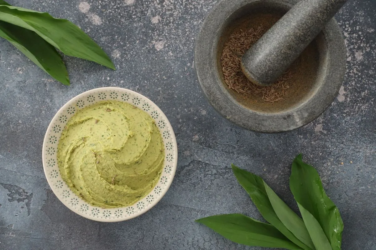 - A megmosott medvehagymát szárazzuk le, vágjuk át késsel, majd adjuk a péphez. Öntsük hozzá az olívaolajat és a tahini szószt, ízesítsük, majd az egészet turmixoljuk krémesre.