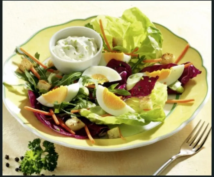 Mosd meg a salátákat és fajtájától függően válaszd szét leveleire. Hámozd meg a sárgarépát, és vágd fel vékonyan. A megtisztított újhagymát karikázd fel, a kemény tojásokat 8-8 cikkre vágd el. Metélőhagymát mosd meg és aprítsd fel.