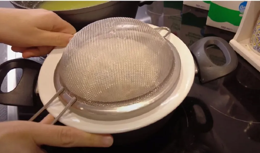 - 5 perc múlva tedd a szűrőbe és szűrd át egy pelenkaszerű anyagon, vagy egy lapos szűrőn.
