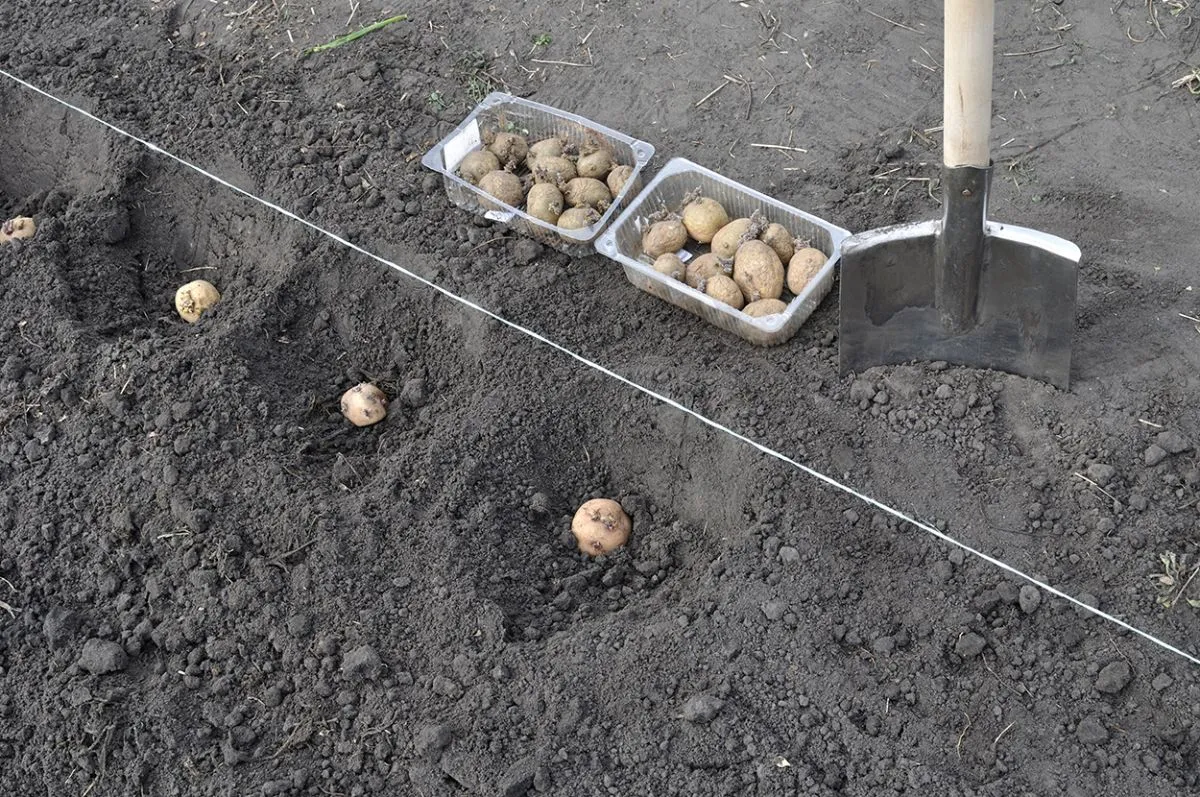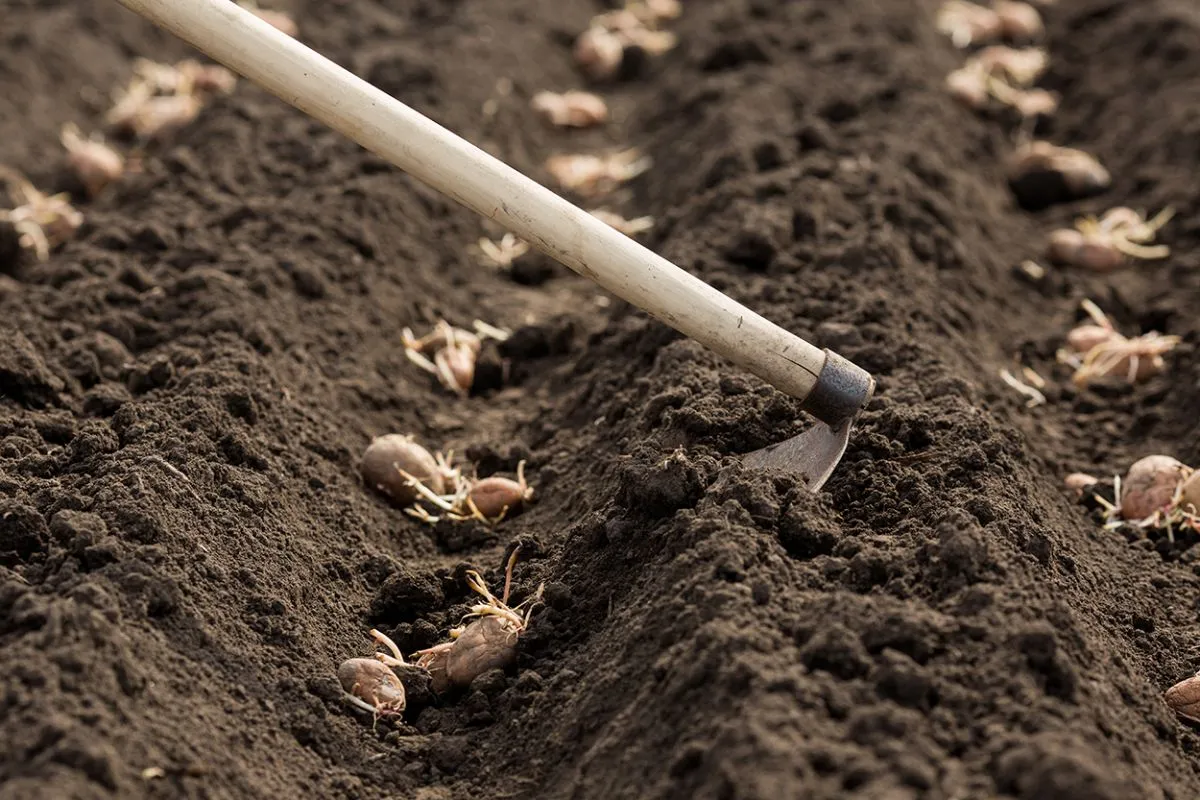 Kétféleképpen szokták kiskertbe ültetni a krumplit: van, aki mély árkot húz a kapával, és abba teszi sorban a vetőgumókat bemetés előtt, mások pedig egy-egy gödröt, vagyis fészket ásnak nekik. Bármelyik módszert is választod, a gumókat 5-8 centi mélyre érdemes ültetni, de mielőtt nekikezdenél, készíts elő egy kevés fahamut. Ugyanis ha szórsz egy kisebb marékkal a gumók alá, kevesebb kártevő támadja majd meg a krumplidat a föld alatt. Ha beszórtad a fahamut, húzz rá egy kevés földet, hogy közvetlenül ne érintkezzenek vele a gumók.
