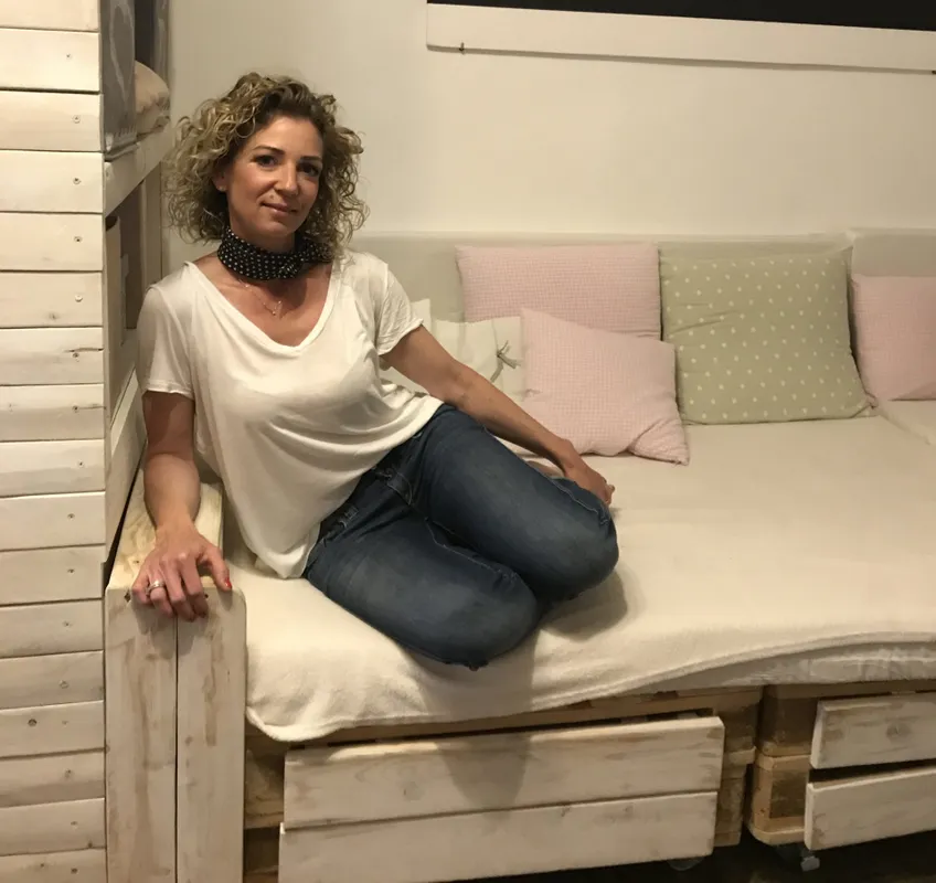 „Az egész úgy kezdődött, hogy a gyerekek ugráltak a kanapén, az persze leszakadt, és szükség volt egy másikra” – meséli Éva. Körülnézett, mi van az üzletekben, de nem csupán az árak zavarták, hanem az is, hogy a megvehető bútorok nem tartósak és nem is egyediek. Szerzett néhány raklapot és elkészítette első kanapéját, amit később kibővített, hogy franciaággyá lehessen alakítani. „A párnát és a háttámlát is én csináltam, mert varrni is tudok” – teszi hozzá. Innen pedig nem volt megállás…