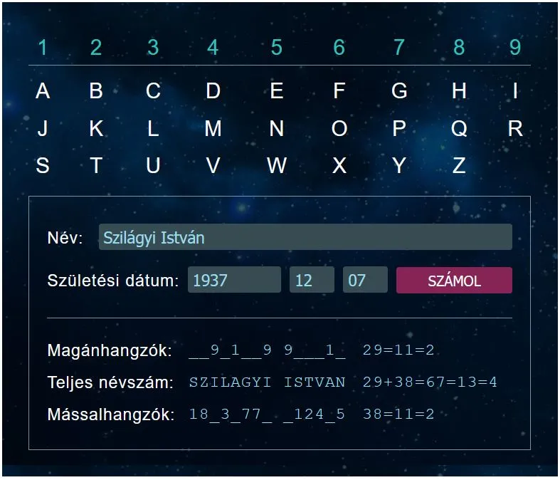 A nevünkben benne van a végzetünk, és mindent elárul rólunk, ezt állítja a számmisztika. Az egyes nevek minden egyes betűjét le lehet fordítani számokra, így minden névnek egy olyan rezgésszáma van, ami megmutatja, hogy az illető milyen energiákat vonz magára. A számítás nem túl bonyolult, de aki nem akarja túl mélyen beleásni magát, az az Astronet.hu online kalkulátorával is megteheti. Szilágyi István családja esetében döbbenetes lett az eredmény.