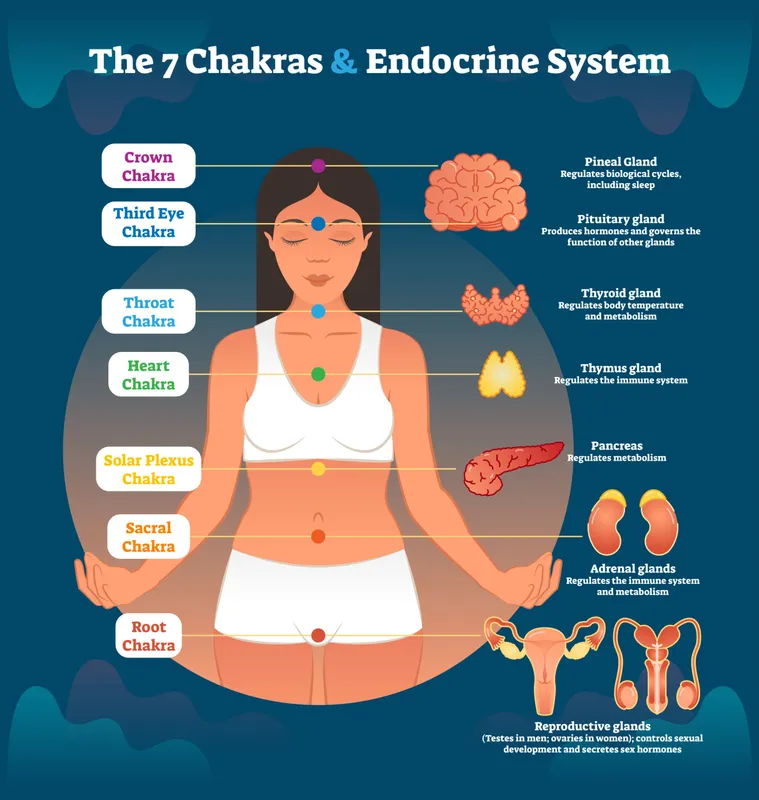 A koronacsakrához tartozó epifízist, azaz tobozmirigyet a lélek székhelyének is tekintik, mely öregkorra elmeszesedik. Nem látod tisztán a lehetőségeidet, képtelen vagy meditálni, összpontosítani, szétszórt, figyelmetlen lehetsz. Betegségei: