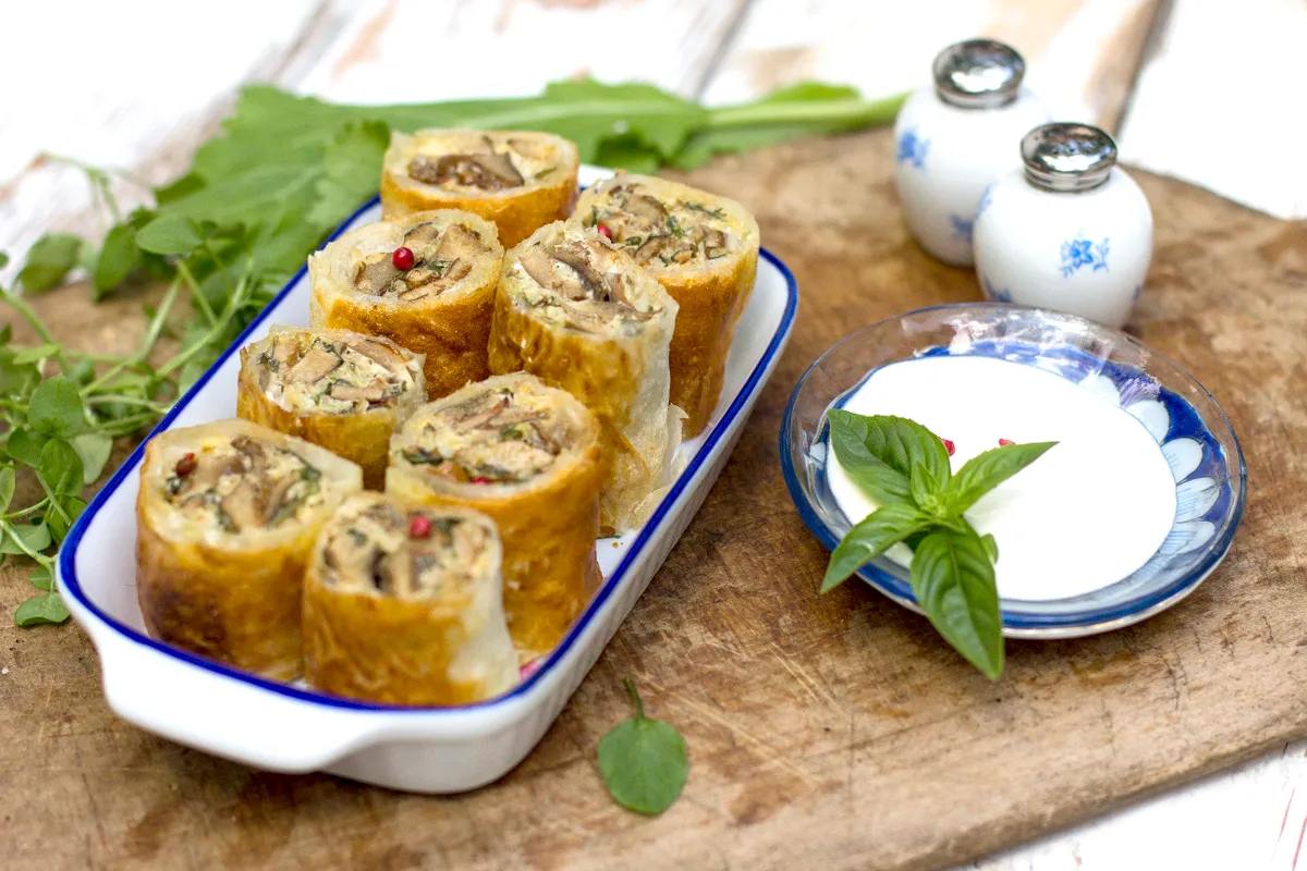 Pirítsuk le kevés olajon a finomra vágott hagymát, majd dobjuk rá a sallangokra szelt laskagombát illetve a zúzott fokhagymát, a szárított lestyánt, a sót és a borsot. Jó 10 percen át pároljuk az alapot, ne fedjük le, hogy a fölös nedvesség el tudjon szökni. Ha már nem annyira masszív a gomba, húzzuk le az edényt a tűzről, hagyjuk kicsit hűlni, és keverjük a raguba a tojást, a zsemlemorzsát és a finomra vágott petrezselymet. A csomagolt réteslapot hajtogassuk szét, és kétlaponént fektessünk nedves konyharuhára. Kenjük meg tejföllel és olajjal. A tészta egyik szélére kétujjnyi vastagságú sávban halmozzunk a gombás töltelékből. A sáv szélén pöndörítsük fel a réteslapot és óvatosan tekerjük fel. Az így kapott rudakat fektessük kiolajozott tepsibe, tetejüket kenjük meg tejföllel és olajjal, és 170 fokon 15-20 perc alatt süssük pirosra. Kínáljunk hozzá zöldfűszeres tejfölt, esetleg reszelt sajtot!
