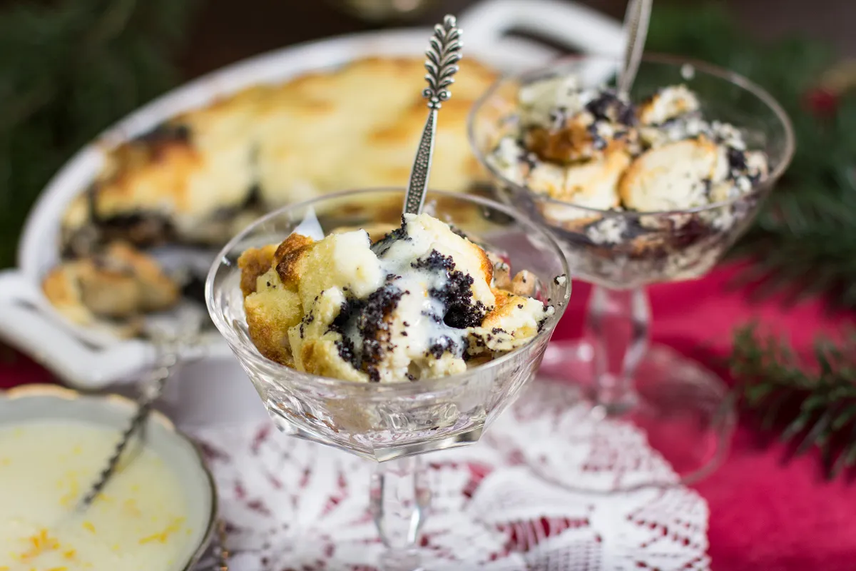Karikázzuk fel a kiflit, locsoljuk be kevés tejjel. A sütőformákat vajazzuk ki, rétegezzük bele a beáztatott kifli karikákat illetve a cukorral, vaníliával és citromhéjjal bekevert mákot. Végül kanalazzunk rá vaníliapudingot, majd 10 perc alatt süssük készre a gubát.