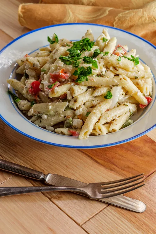Greek,Penne,Aegean,Pasta,Salad,With,Crumbled,Feta,Cheese