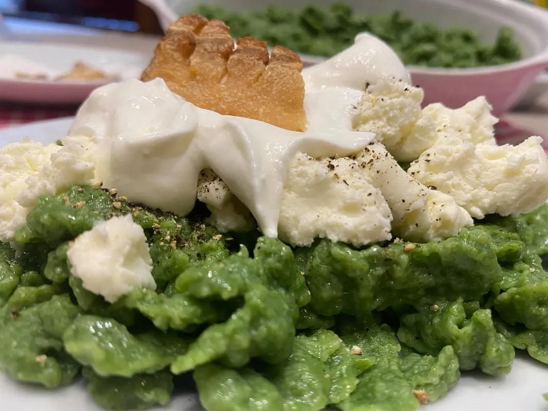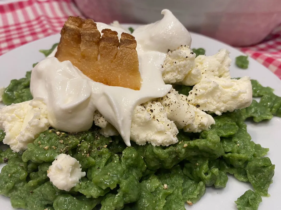 A zöld színű Fradi-nokedli a végtelenségig variálható: tehetsz a tetejére tehén- vagy juhtúrót, szalonnát, gombapörköltet, sajtot, tejfölt, megbolondíthatod egy kis fokhagymával vagy póréhagymával is, de készíthetsz hozzá sonkás szószt is! Mi most a túrós-tejfölös változatot mutatjuk meg ebben az egyszerű receptben.