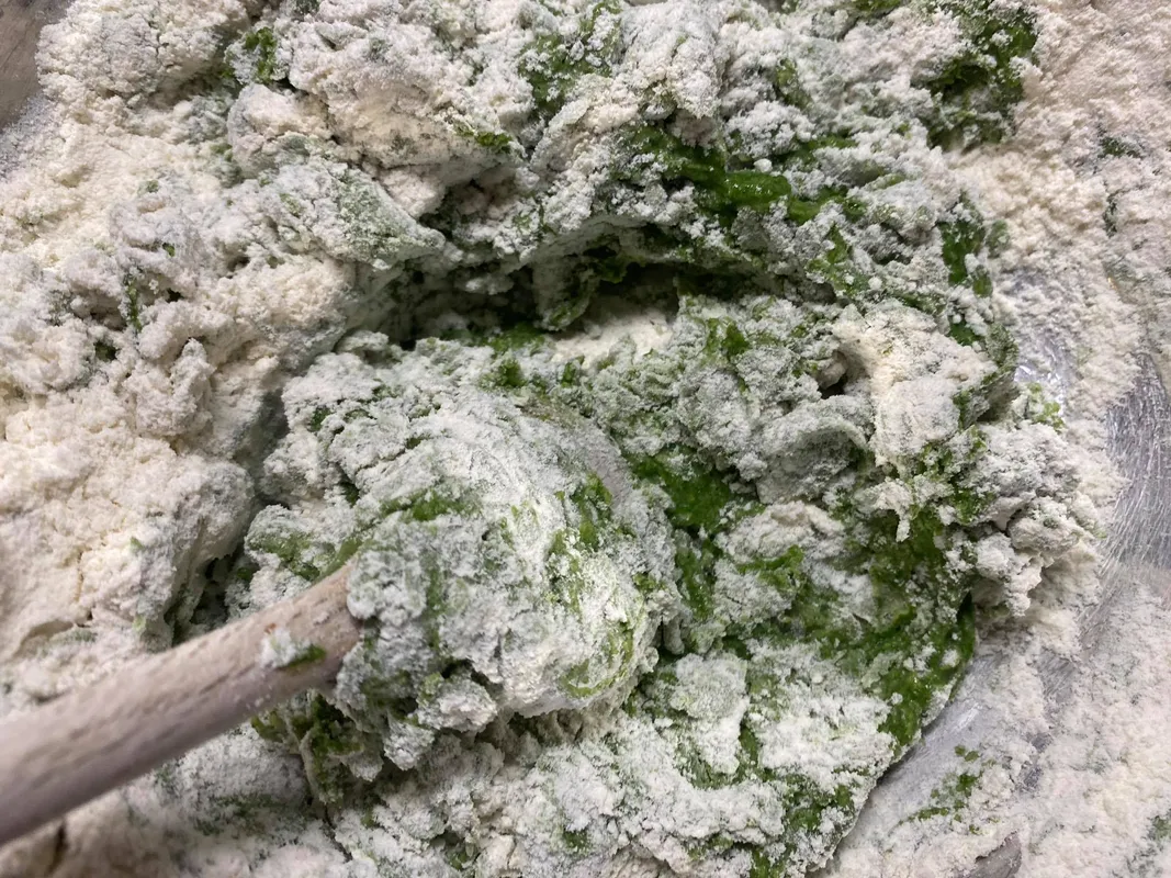2. A spenótos tojással és a liszttel ízlés szerint sózva készíts laza szerkezetű tésztát.