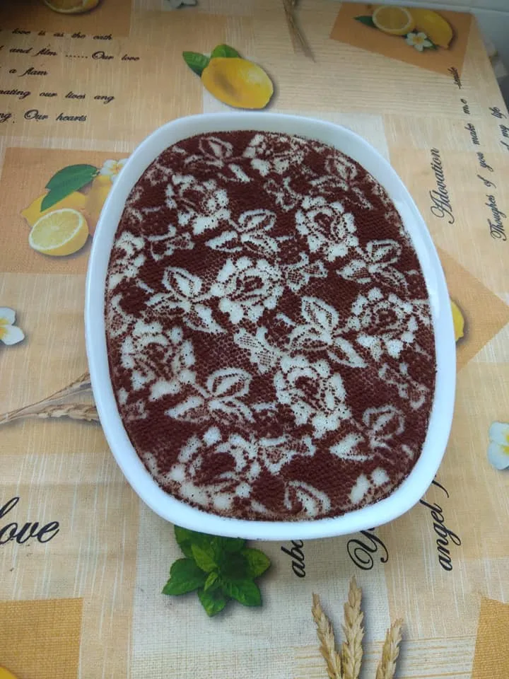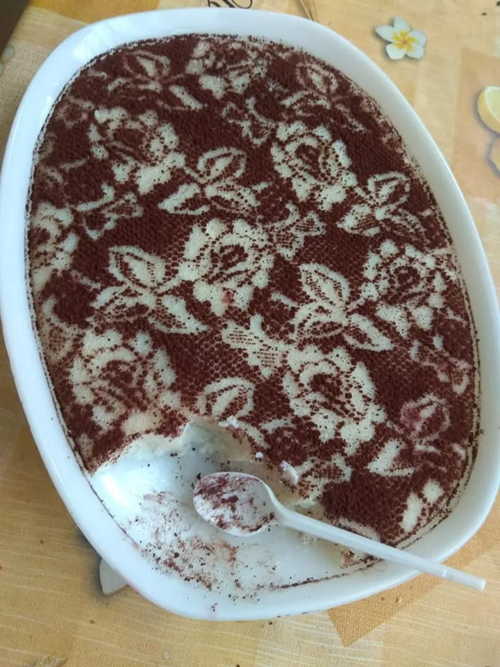 ...ezután kell ráteríteni a csipketerítőt, és mehet a kakaópor! Utána óvatosan le kell venni a csipkét, és a kész is a csoda. Többen kérdezték tőle, a terítőből kijön-e a kakaópor; Vali megnyugtatott mindenkit, hogy egy sima mosással el is tűnik.