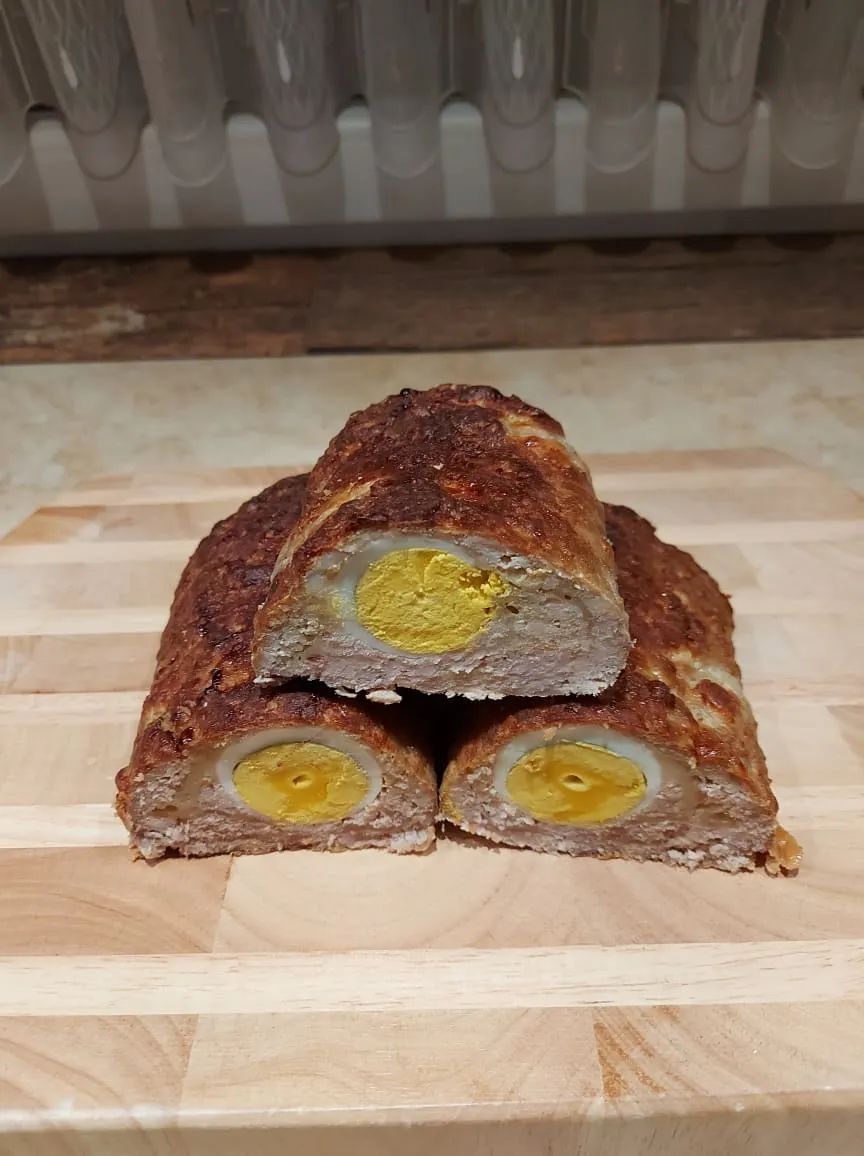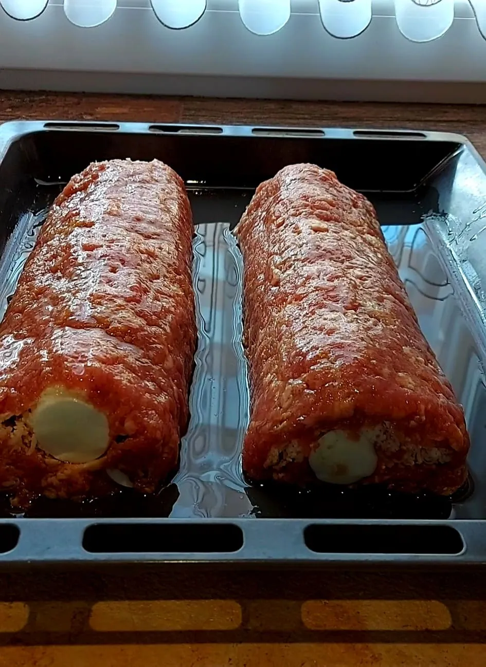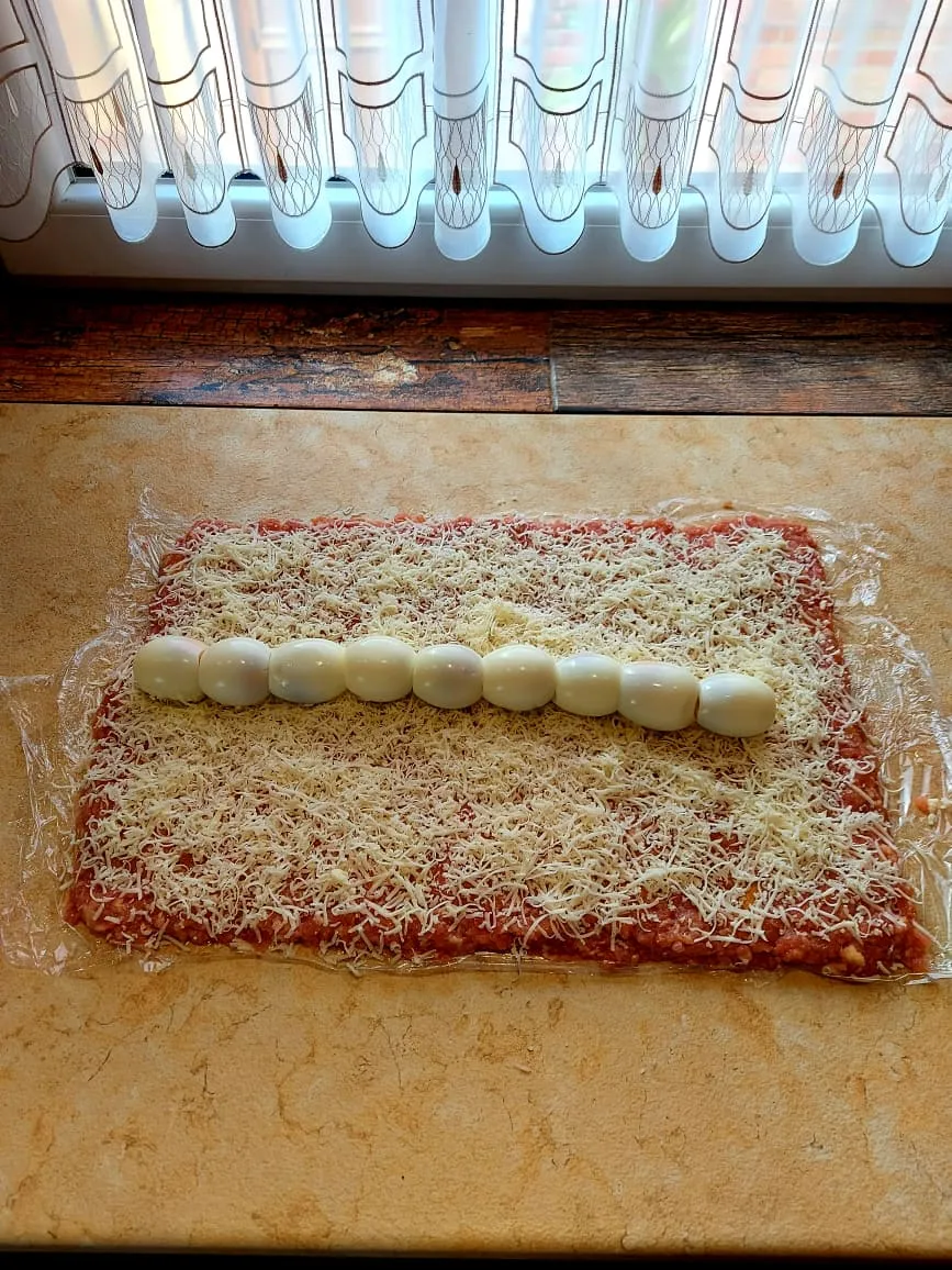 Pakold a közepére a főtt tojásokat, majd a fólia segítségével tekerd fel a rudat. Tedd tepsibe, tegyél alá egy kevés vizet, majd kend le tojással a tetejét, és szórd rá a zsemlemorzsát.