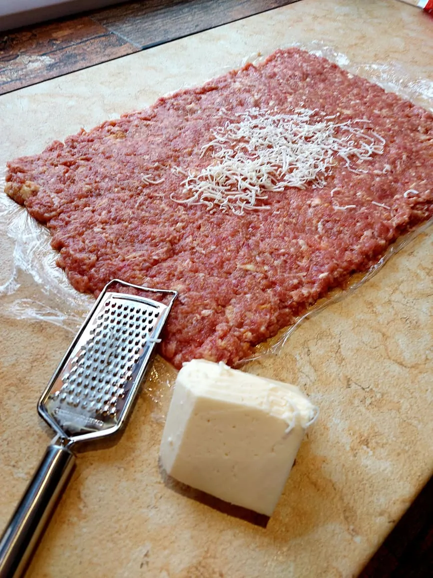 Teríts le egy gyúró- vagy vágódeszkára egy tepsi méretű folpackot, majd egyenletesen oszlasd el rajta a fasírtmasszát. Erre szórd rá a reszelt sajtot úgy, hogy mindenhova jusson.