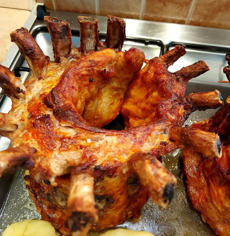 Ő ugyanis a tepsiben nem elfekteti, hanem állítva helyezi el a szép húsos oldalas darabokat, és kört formáz belőlük. Hogy egyben maradjon a hús, az egymásba érő két végét fogpiszkálóval tűzi meg. Így az oldalas, miután parádésra sül, épp úgy néz ki, mint egy korona. Praktikusan ez a neve is: koronaoldalas. Amikor megmutatta remekművét a profi háziasszonyokat tömörítő Vali hagyományos konyhája című Facebook csoportban, oda meg vissza voltak a gyönyörűségtől a nők és mindenki a receptet követelte. Íme: