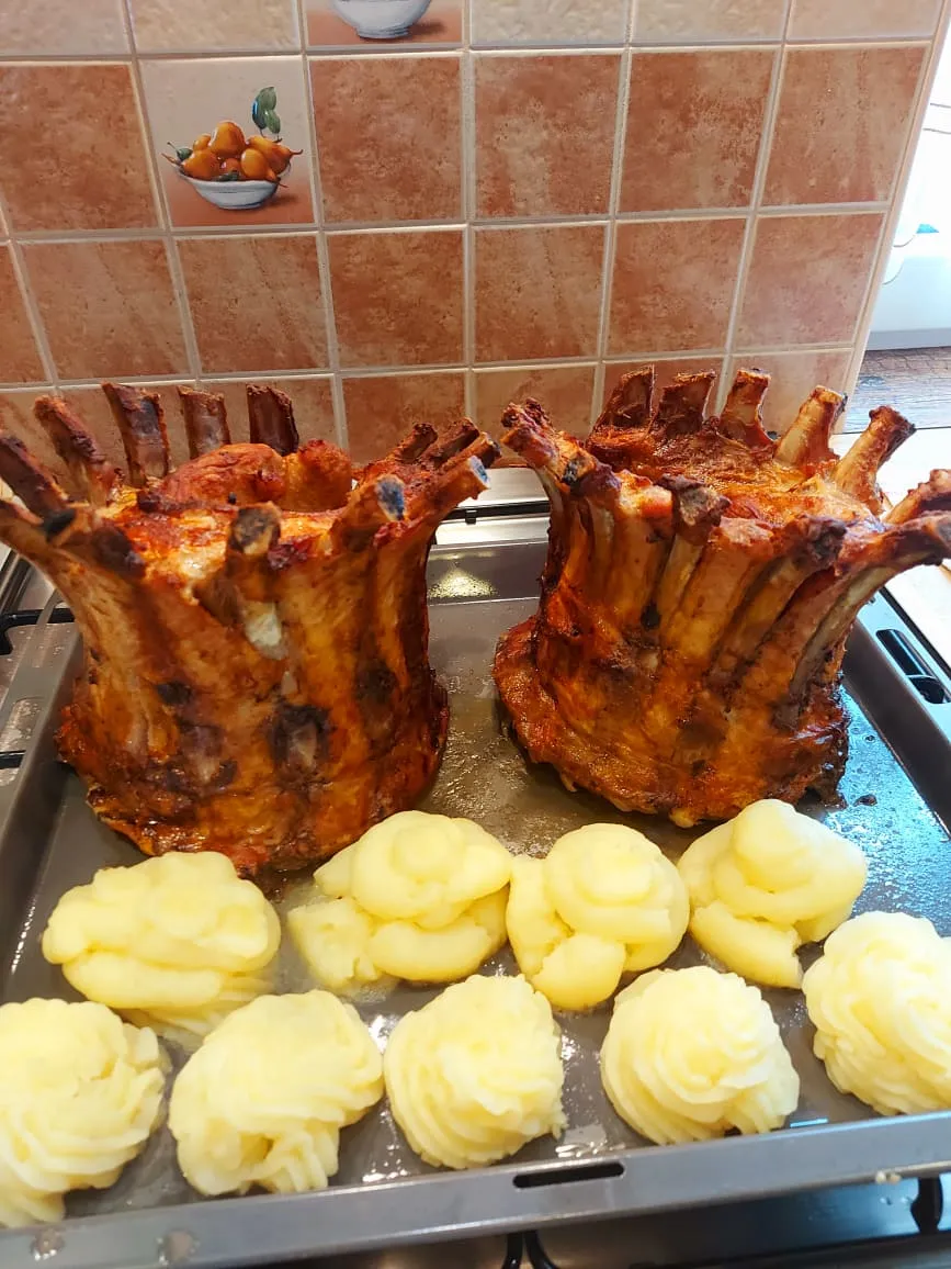 4. Óvatosan emeljük ki a tepsik és tegyük deszkára. Bontsuk le a fóliát, vigyázzunk, mert kicsap a forró gőz! Az oldalast kenjük át vízzel kissé felhígított pirosarannyal – érdemes ecsetet használni. A leemelt fóliát pedig igazítsuk a csontok végére, hogy ne égjenek meg túlságosan. Így toljuk vissza a tepsit a sütőbe kb 15 percre, de a hőmérsékletet most már vegyük vissza 160 fokra. A végeredmény csodálatos pirosra sült koronaoldalas, amit sült krumplival, krumplipürével és házi savanyúsággal érdemes tálalni!