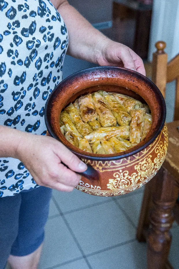 • Tekerd a káposztalevelekbe a kész tölteléket, majd sorakoztasd őket egy cserépedénybe, aminek az aljába füstölt tarját tettél. Önts fel annyi vízzel, hogy éppen csak ellepje, és főzd negyven percig.