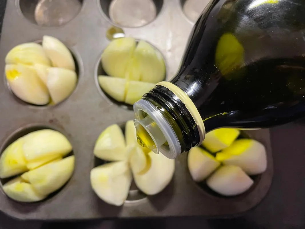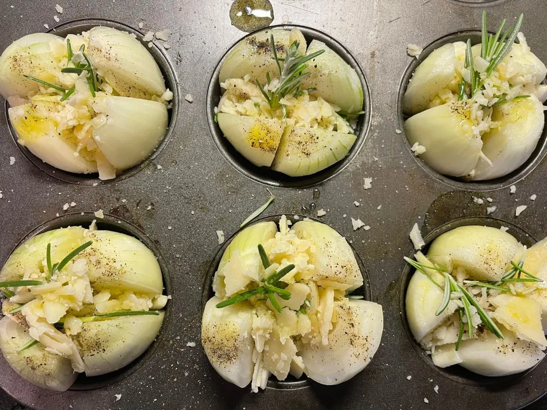 - Tisztítsd meg a hagymákat, vágd le a végeit, és vágd fel négy egyforma részre. Tedd bele a muffin sütőbe őket. Önts rá olívaolajat.