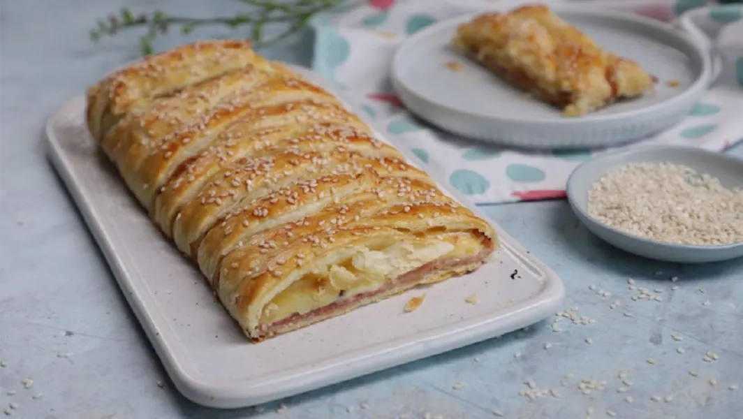 Először a tészta alját és tetejét a sonka-sajt szeletekre hajtsd, majd alulról felfelé haladva, felváltva hajtogasd rá a tésztacsíkokokat.