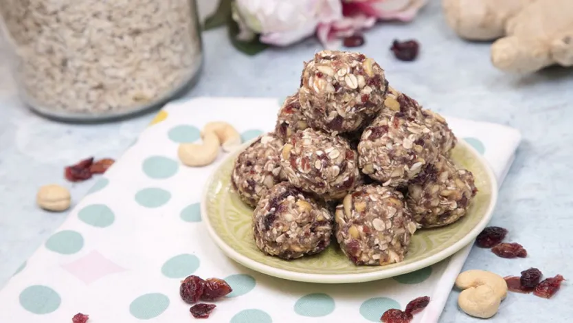 A gyömbért hámozd meg, majd darabold fel! Ezután a nagyobb karikákra vágott banánnal és az aszalt vörös áfonyával turmixold alaposan össze! A pépes hozzávalókat kanalazd egy tálba, és egy fakanállal forgasd bele a zabpelyhet is!