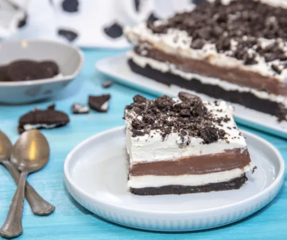 Az oreo lasagne kekszrétegéhez törd össze a kekszet. Nagyjából egy csészényit tegyél belőle félre, a többit egy tálba keverd össze olvasztott vajjal, és nyomkodd bele a sütőformába. Majd mehet be a hűtőbe.