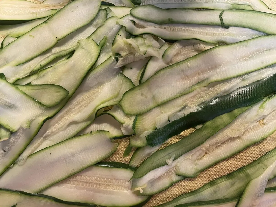 A cukkinit mosd meg, zöldséghámozóval vágd szeletekre, majd a szeleteket kb 1 percre tedd forrásban lévő nagyon sós vízbe. Emeld ki a vízből a cukkiniszeleteket és egy konyharuhán hagyd őket megszikkadni. A kolbászt apróra vágd fel 2-3 cm-es darabokra.