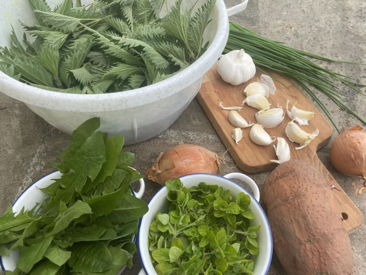Csalánleves ehető réti növényekkel