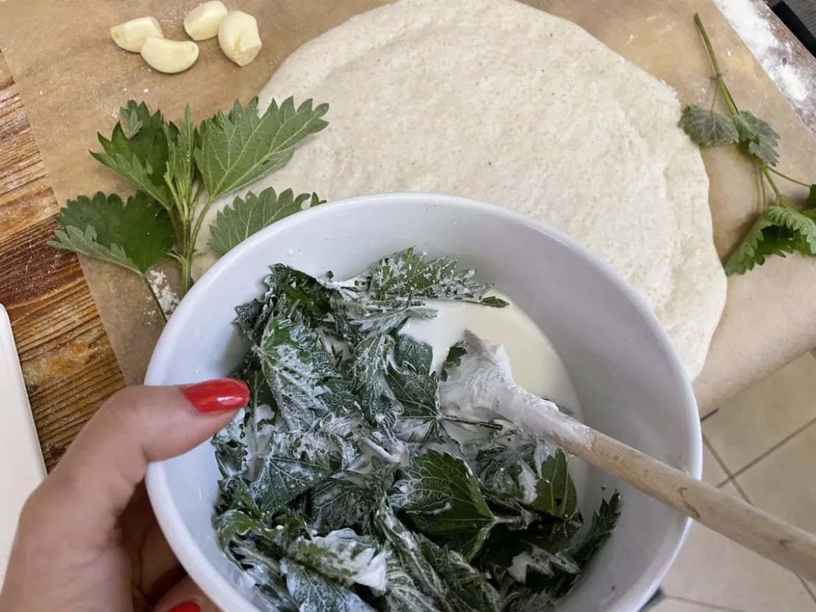 - Közben készítsd el a csalános feltétet: reszeld le a fokhagymát, keverd el a tejfölben, forgasd meg benne a csalánleveleket, és reszeld le a sajtot.