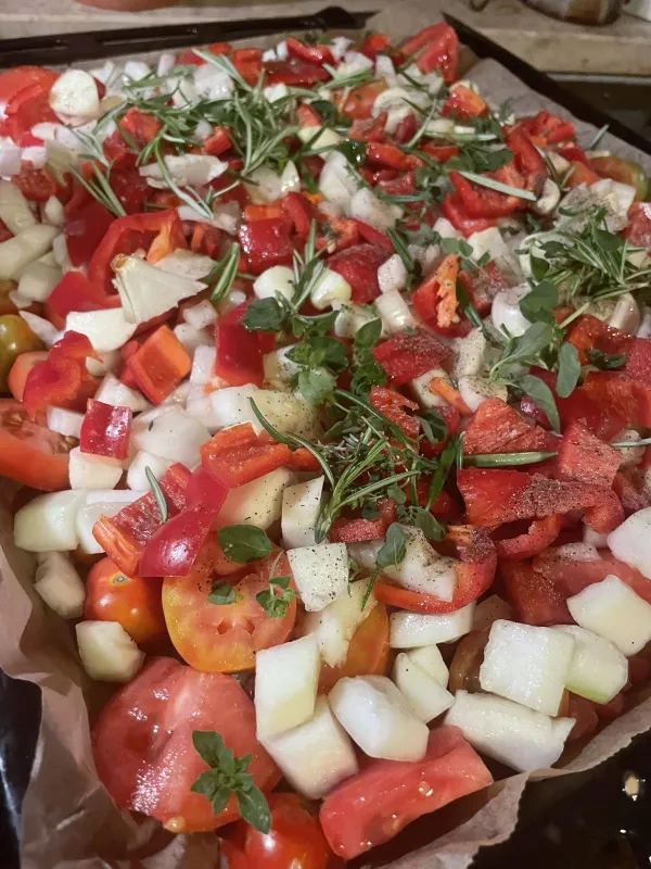 - Önts egy kevés olajat egy mélyebb tepsibe, tedd bele a darabolt zöldségeket, szórd meg őket sóval, a fűszerekkel, tedd hozzájuk a meghámozott fokhagymagerezdeket és a zöldfűszereket.
