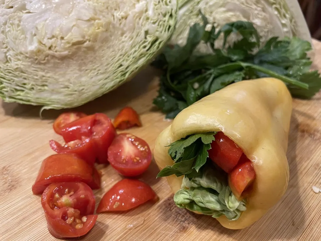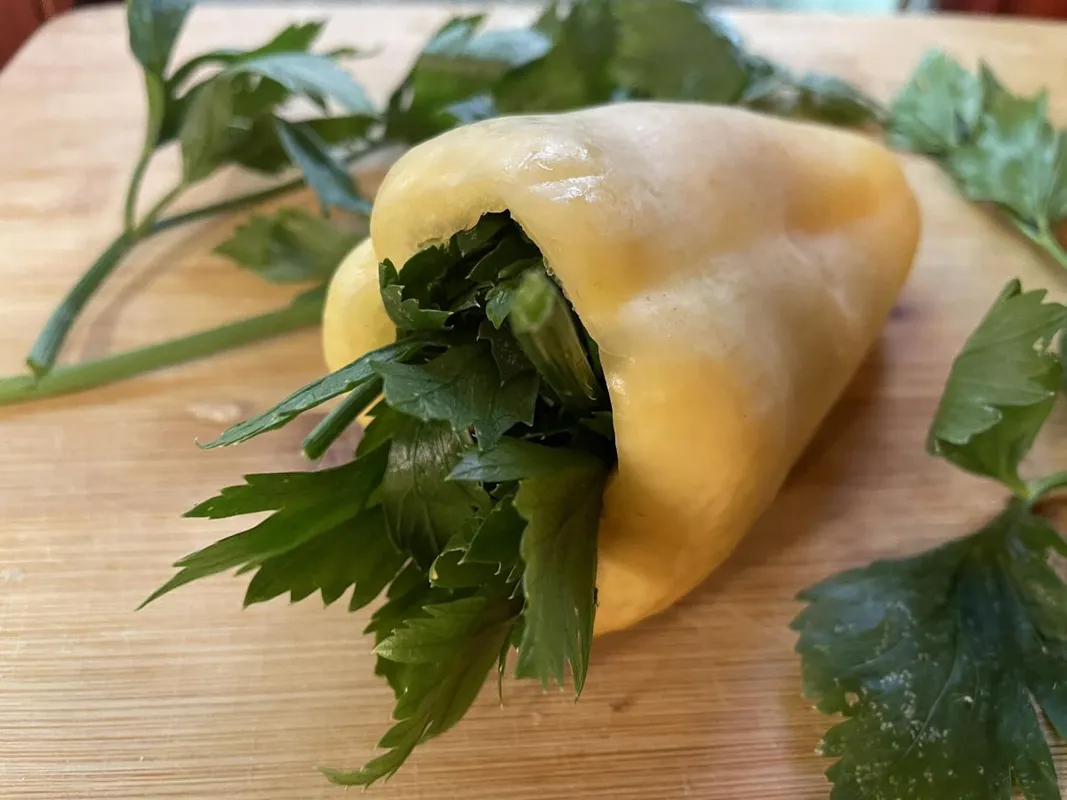 Nem lehet elrontani a zöldségekkel töltött paprikát, hiszen mindenki a saját és a család szája íze szerint készíti. Alapból a kicsumázott paprika belsejébe frissen szedett petrezselyem- és zellerzöld mindenképpen kerül, de van, aki kiegészíti némi lestyánnal, és sokan tesznek egy kevés paradicsomot is a paprika belsejébe; de emellé tehetsz még friss káposztalevelet is.