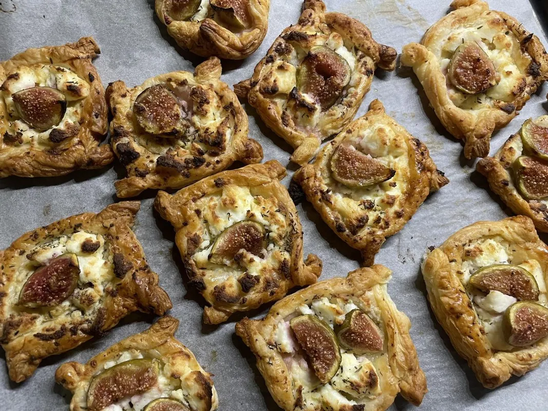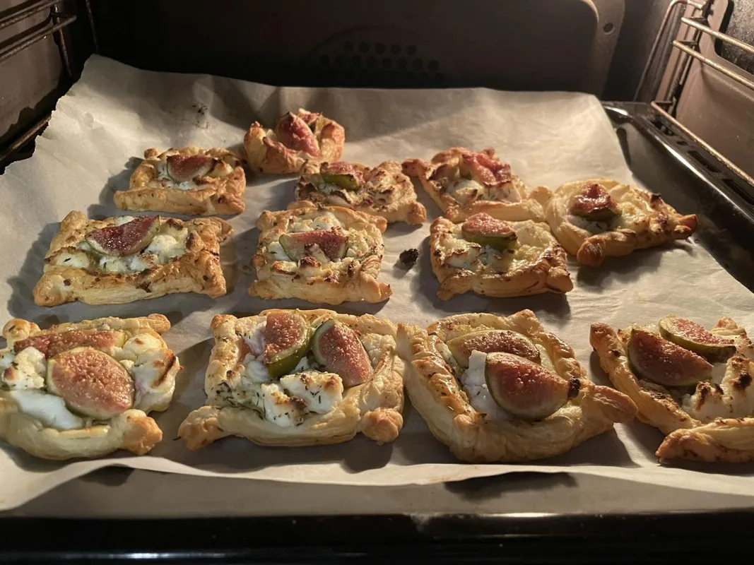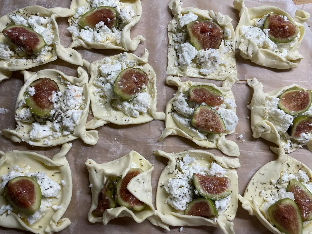 - Oszd el a 12 tésztakocka között a kecskesajtot, majd a megmosott és negyedekbe vágott fügéket. Szórj minden kockára egy kevés kakukkfüvet, majd hajtogasd fel a tésztakockák széleit, és tedd a tepsit előmelegített, 200 fokos sütőbe. 15-20 perc alatt süsd ropogósra.