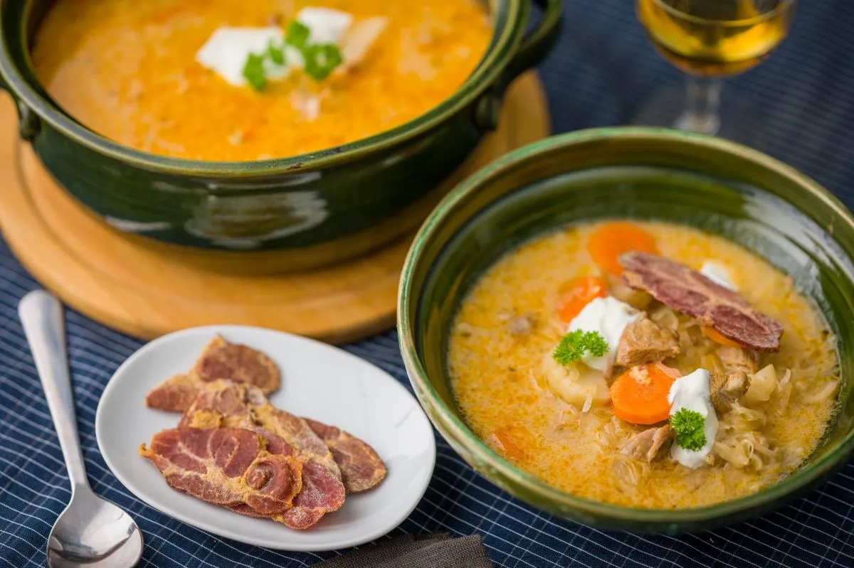 2. A nyers tarját vágjuk kockára, tegyük rá a hagymás zsírra, és erős lángon pirítsuk fehéredésig. Hintsük meg sóval, borssal, fűszerezzük őrölt babérral, köménnyel, pirospaprikával, adjuk hozzá a meghámozott, felaprított sárgarépát és petrezselyemgyökeret. 3. Adjuk hozzá az átvágott savanyú káposztát is, öntsük fel a pezsgővel és az alaplével, és főzzük addig, míg minden meg nem puhul benne. Végül két evőkanál lisztet keverjünk csomómentesre egy kis hideg vízben, keverjük bele a tejfölt, és sűrítsük be vele a levest.
