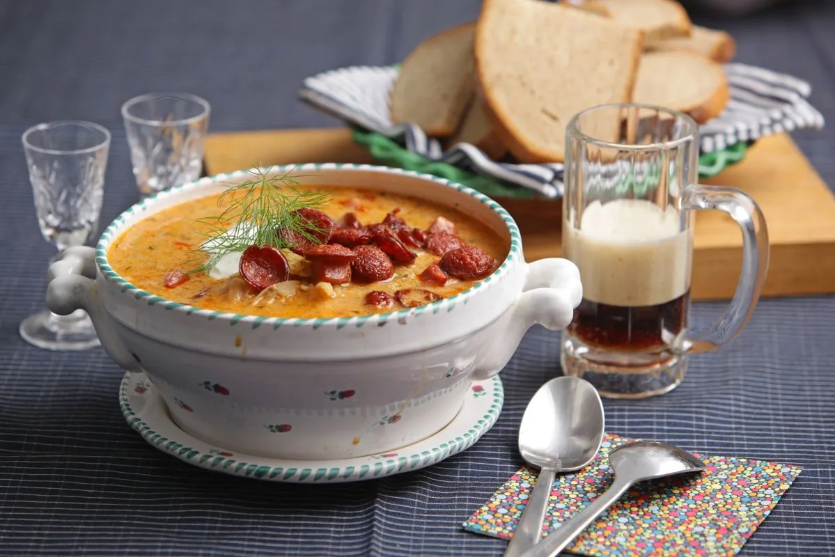 4. Közben a kolbászt karikázzuk fel és egy serpenyőben süssük ropogósra. A leveshez öntsük hozzá a maradék sört, rakjuk bele a sült kolbászt, végül készítsünk habarást a lisztből a tejfölből és sűrítsük be a levest. Szórjuk meg frissen vágott kaporral. Tejföllel, friss kenyérrel tálaljuk.