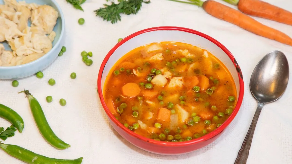 - Pucold meg a sárgarépát és karikázd fel, majd kevés zsiradékon dinszteld meg, szórd rá a pirospaprikát, de gyorsan vedd is le a tűzről. Add hozzá a zöldborsót, a paradicsomot, a zöldpaprikát a karalábét , a petrezselymet és öntsd fel vízzel. Sózd, borsozd és egy késhegynyi cukorral ízesítsd.