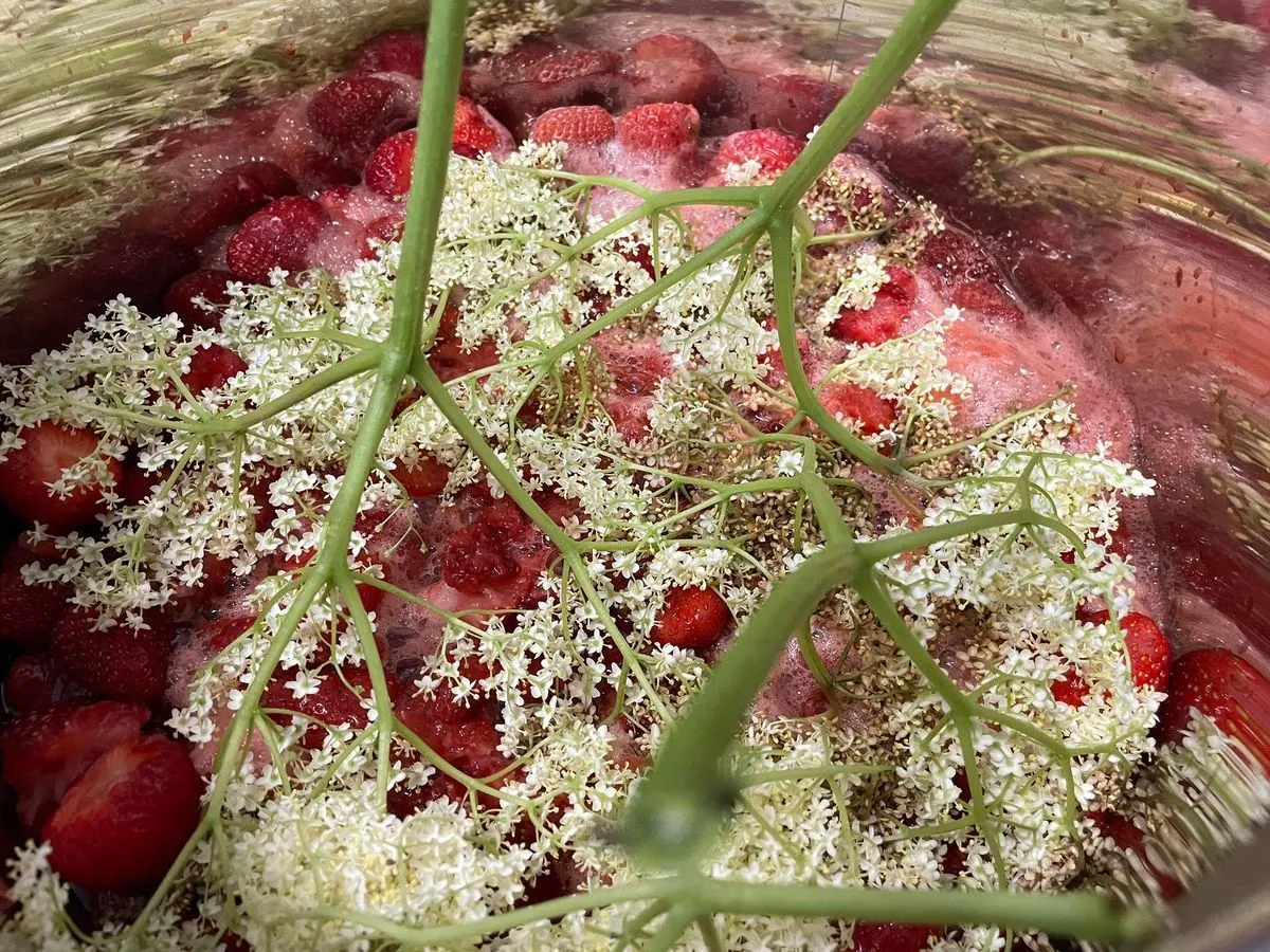 - Alaposan mosd meg a bodzavirágokat folyó víz alatt, majd az eperrel együtt tedd fel főni egy fazékban. Add hozzá a cukor felét, és főzd együtt 15 percig.