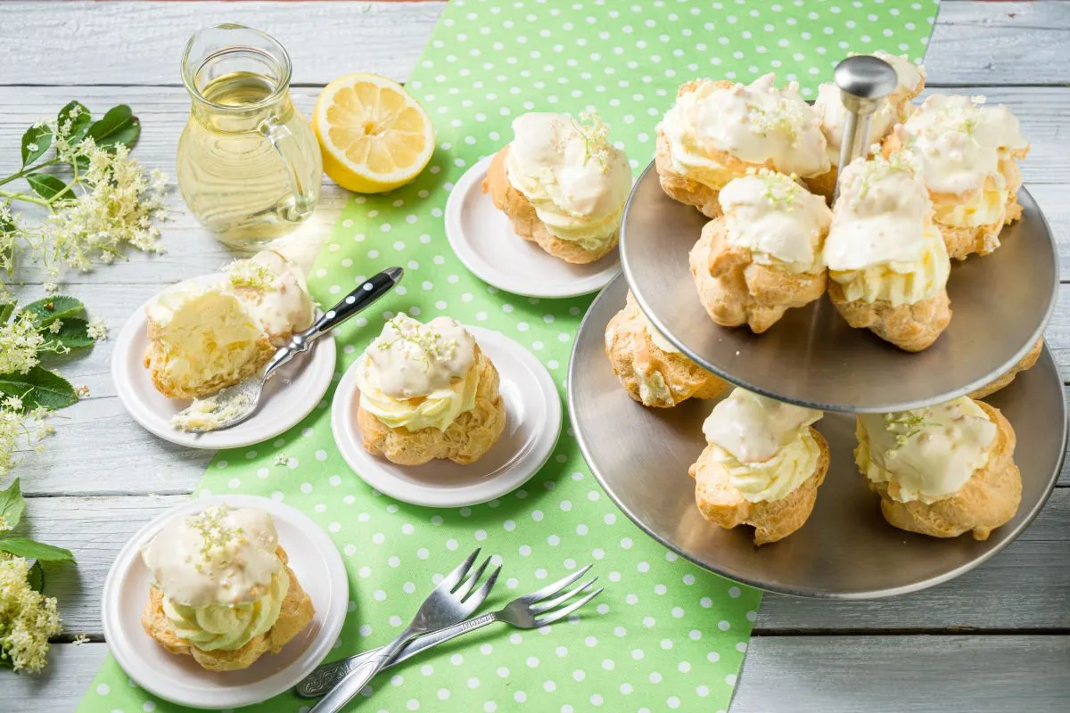 3. A krémhez először főzzük meg a vaníliás pudingport a tej és a bodzaszörp keverékében, keverjük hozzá a citromlevet, a vaníliás cukrot és az egy evőkanál cukrot. A tejszínből verjünk habot. A kihűlt pudinghoz keverjük hozzá a kihabosított vajat és a tejszínhabot. Töltsük csillagcsőrös habzsákba.