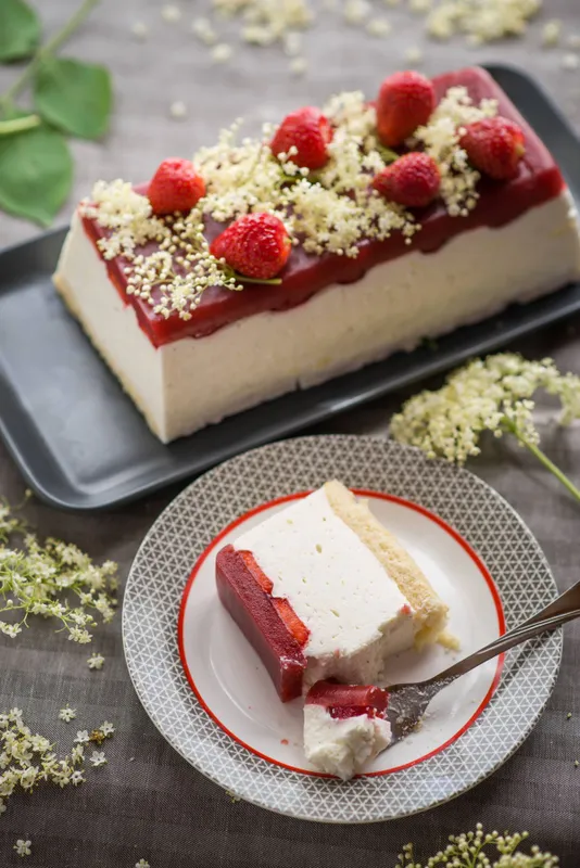 4. Pár órára tegyük a hűtőszekrénybe, hogy megdermedjen. Ha már megszilárdult, akkor a babapiskótákat mártsuk meg a bodzaszörppel megmelegített tejben, és szép sorban rakjuk rá a krém tetejére. Hűtsük még pár órát, hogy biztosan megszilárduljon a közepe is. Tálalás előtt óvatosan fordítsuk át egy tálra. A tetejét díszítsük friss eperrel és bodzavirággal.