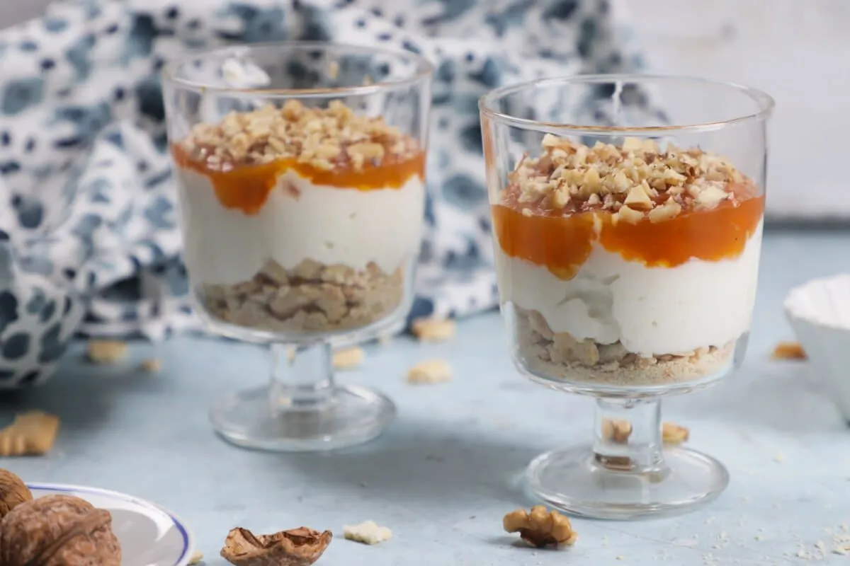 - Keverd el a túrót a görög joghurttal és a mézzel, add hozzá a citromhéjat. Kanalazd a kekszmorzsa tetejére, majd rétegezz rá baracklekvárt.