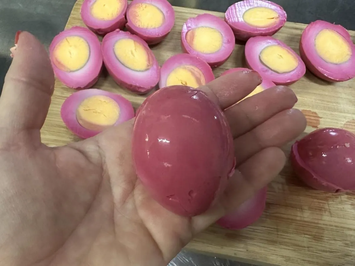 - A tojásokat tedd egy zárható edénybe, pl. befőttesüvegbe, öntsd rájuk a céklalevet, és hagyd őket állni benne legalább 4-6 órán át, de akár egész éjszakára is a hűtőben maradhatnak. Minél tovább áznak, annál élénkebb színük lesz.