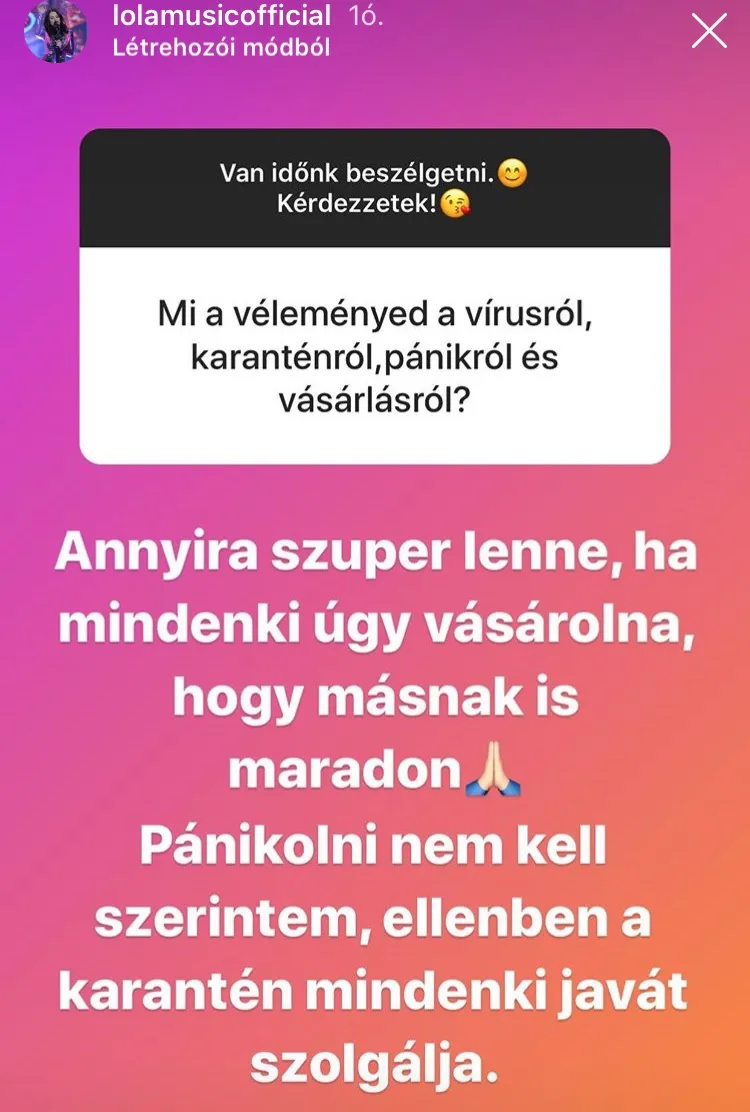 A napokban Lola is úgy döntött, hogy párjával együtt önkéntes karanténba vonul a járvány idejére. Az énekesnő ennek apropóján beszélgetett a rajongóival, akik leginkább arra voltak kíváncsiak, mi a véleménye a kialakult helyzetről.