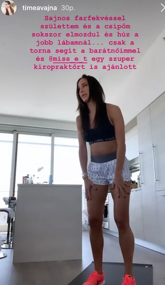 „Sajnos farfekvéssel születtem, és a csípőm sokszor elmozdul, húz a jobb lábamnál. Csak a torna segít a barátnőimmel” – írta Timi.