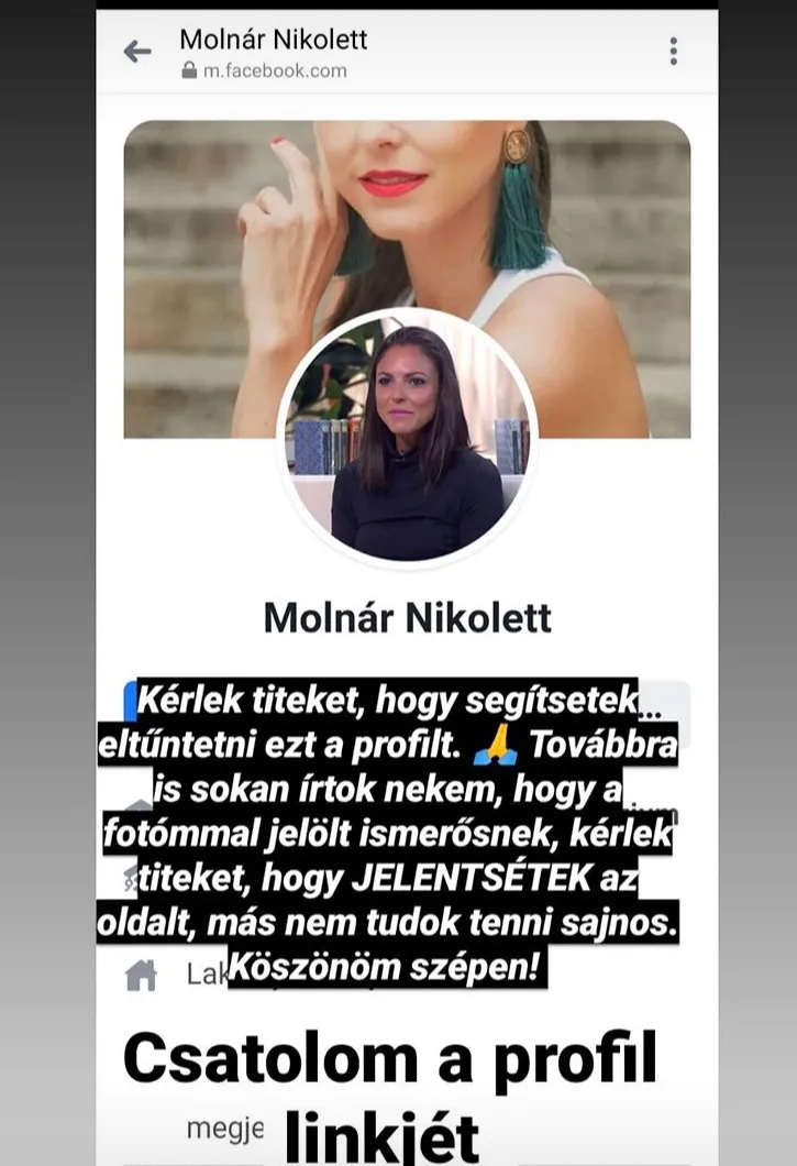 „Kérlek titeket, hogy segítsetek eltüntetni ezt a profilt. Továbbra is sokan írtok nekem, hogy a fotóimmal jelölt ismerősnek. Kérlek titeket, hogy jelentsétek az oldalt, mást nem tudok tenni sajnos” – fogalmazott Anita.