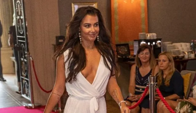 Az énekesnő egy csinos fehér nadrágruhában jelent meg, melynek annyira mély volt a dekoltázsa, hogy mellei kivillantak ruhájából – írja a Bors.