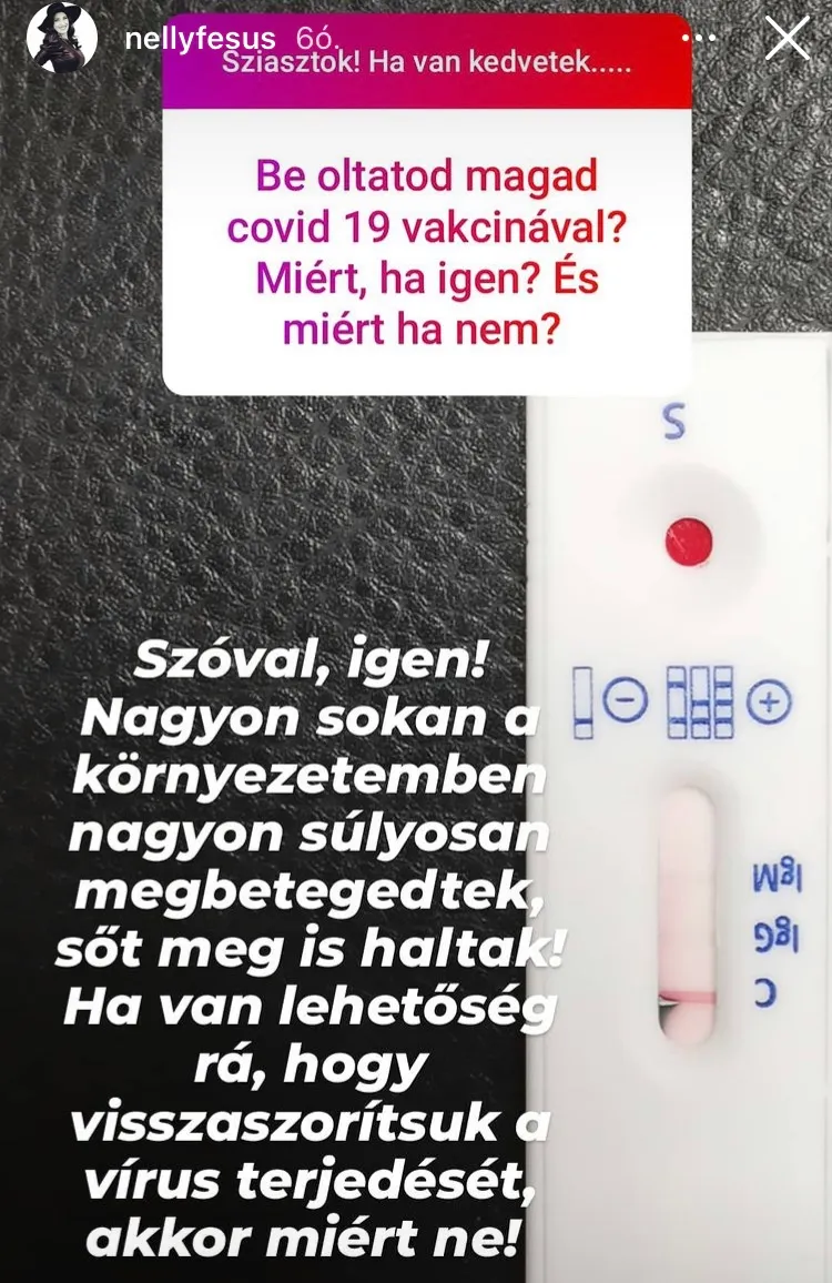 „Nagyon sokan a környezetemben súlyosan megbetegedtek, sőt meg is haltak! Ha van lehetőség rá, hogy visszaszorítsuk a vírus terjedését, akkor miért ne!” – fogalmazott a közösségi oldalán Nelly.