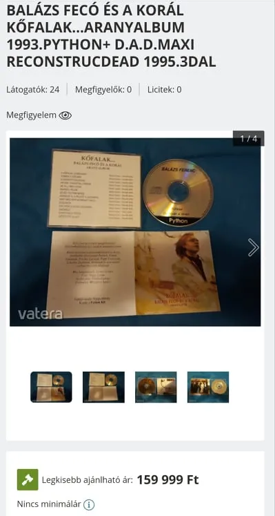 A Ripost olvasója az egyik internetes áruházban bukkant rá arra a hirdetésre, amiben 159 999 forintért árulják a Korál néhai énekesének Kőfalak című aranyalbumát, plusz további két kiadványt. Sőt, hogy egész pontosak legyünk, ez a tetemes összeg csak a legkisebb ajánlható ár, a lemezek ugyanis kalapács alá kerültek, a licit március 14-ig tart, igaz, még egyetlen ajánlat sem érkezett.